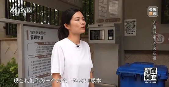 杭州萧山区盈丰街道城管办 施菲菲:我们这个小区从2018年开始垃圾分类工作的,我们萧山区的模式有个1.0、2.0,以及3.0。1.0主要是从易腐垃圾精准分类开始的,居民把易腐垃圾单独分离出来。2.0我们称它为一个定时定点的模式,比方说像这个小区八幢楼,我们选了两个点位,然后有专门的引导人员,引导居民去分类投放,包括我们垃圾桶也变成了四个。现在我们称为六全一码式3.0版本,引入了一个可回收物,一个有价回收,现阶段我还有一个奖励的机制。